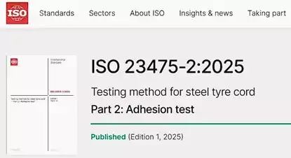 2025年10月,ISO组织(国际标准化组织)在官网上正式颁布了ISO23475-2:2025 Testing method for steel tyre cord – Part 2: Adhesion test (钢帘线测试方法 -- 第二部分:粘合测试)。该标准由贝卡尔特技术研发中心和冶金工业信息标准研究院联合主导制定。